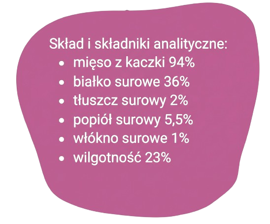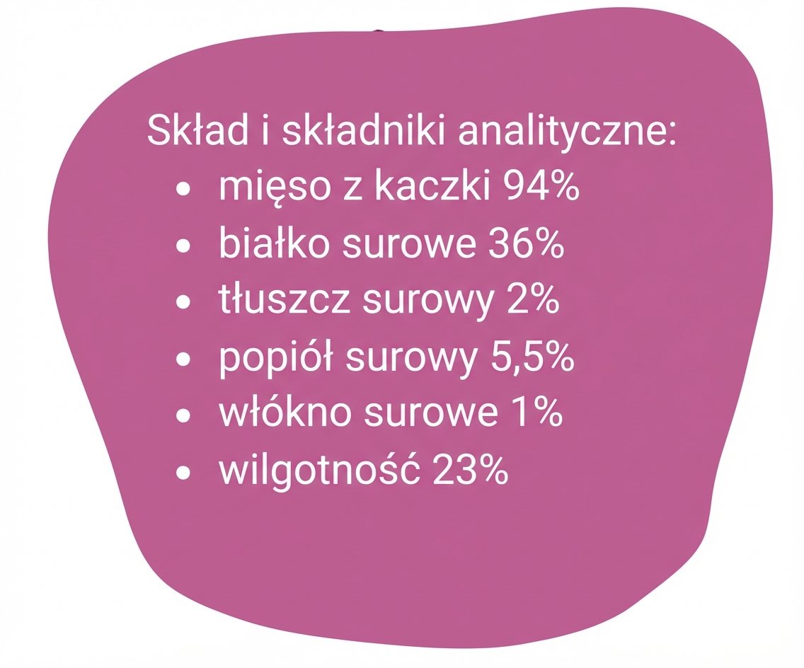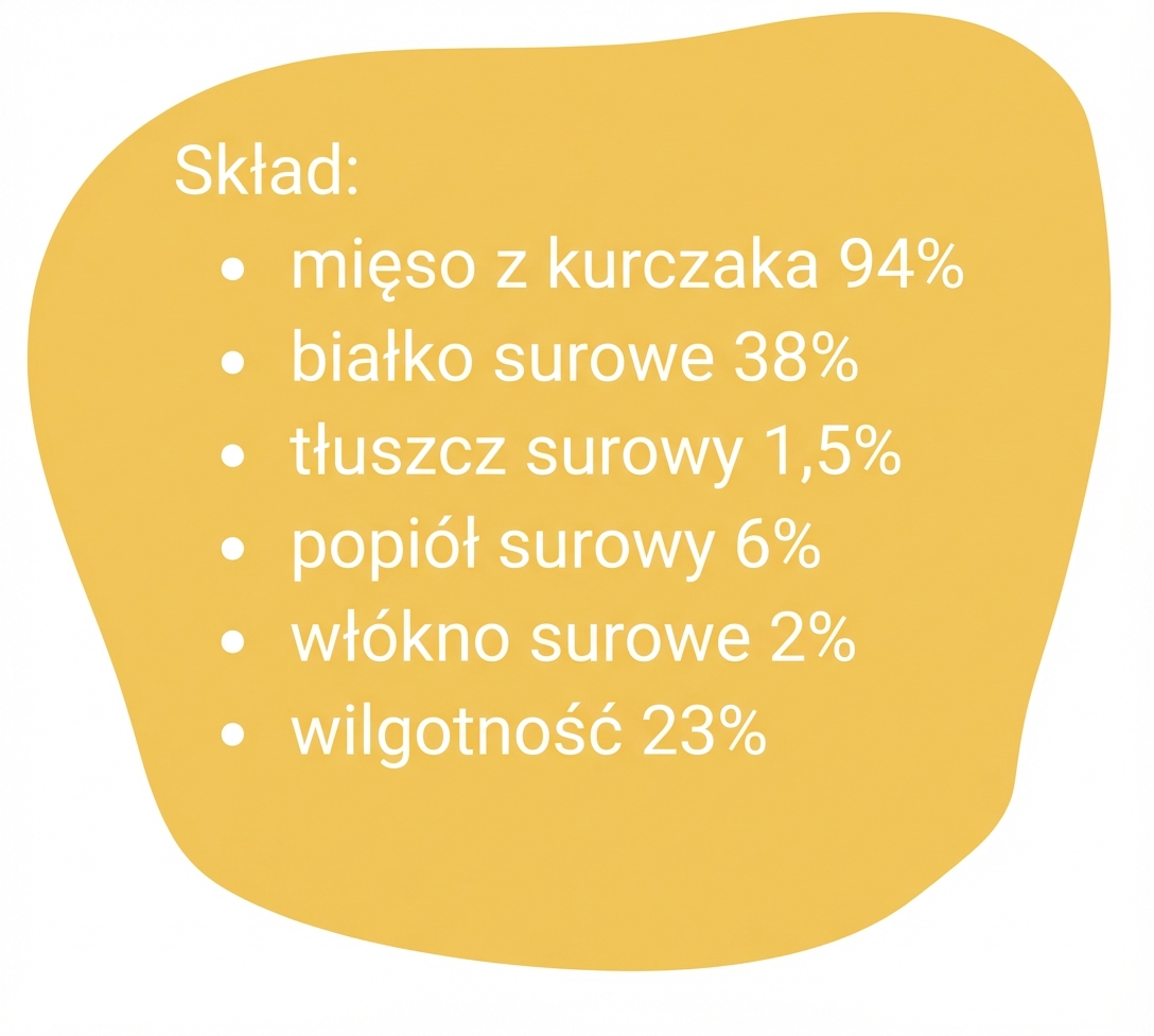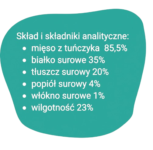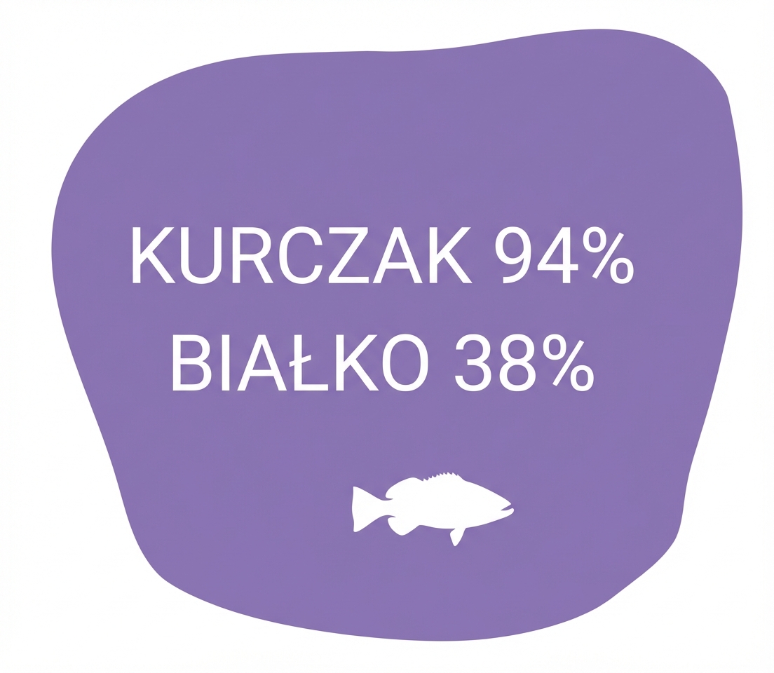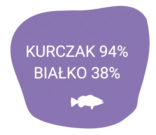 Rozpływające się w ustach, pyszne, dające niezapomniane doznania świeżości i jakości. Wysoka zawartość mięsa aż 94% oraz czystego białka na poziomie 36% niezbędnego do budowy tkanek, produkcji hormonów i enzymów z kompletem koniecznych do prawidłowego rozwoju aminokwasów.